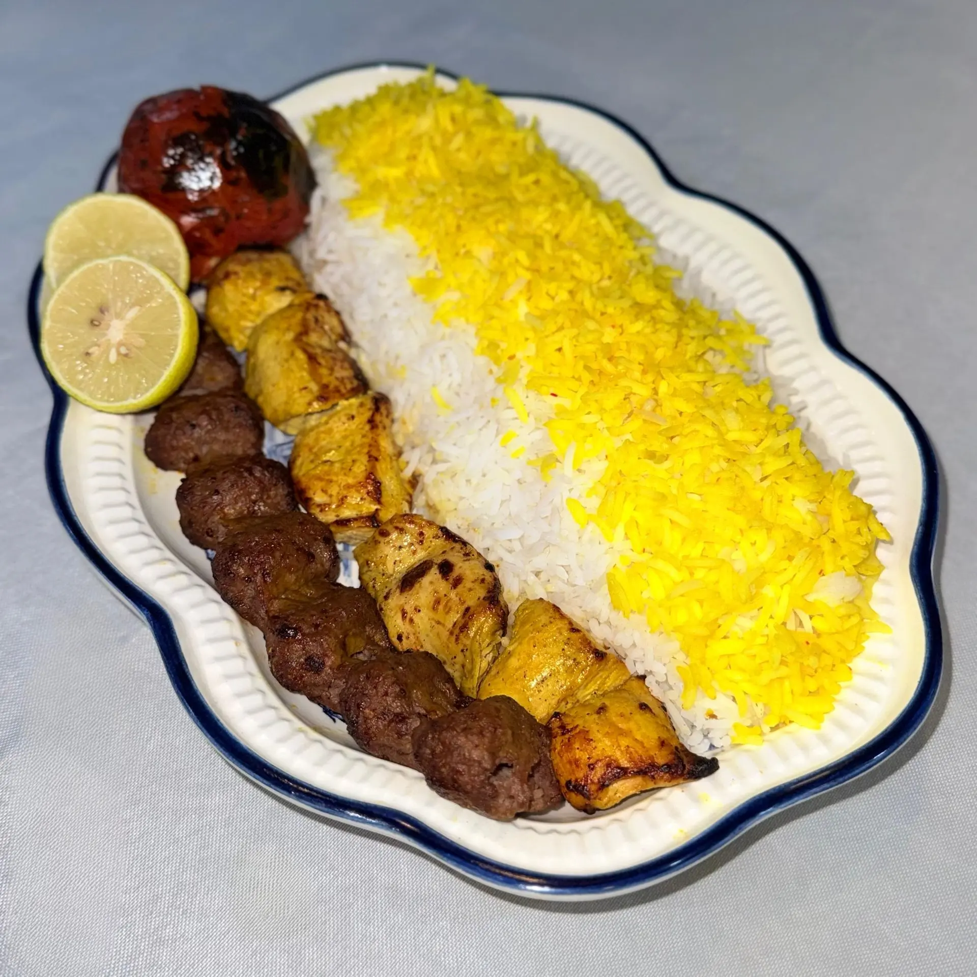 350 گرم برنج ایرانی معطر به همراه زعفران، 250 گرم سینه مرغ ممتاز ،گوجه کبابی ،لیمو